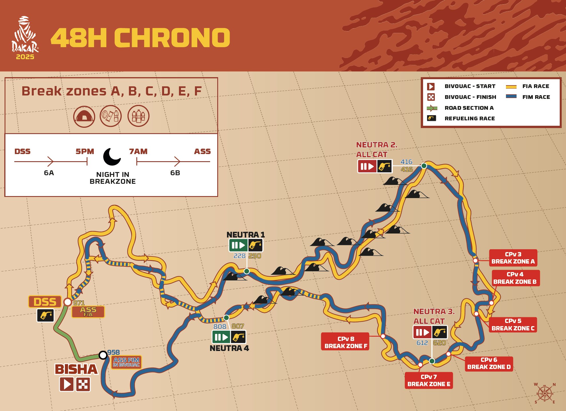 En la edición de 2025, este desafío mayúsculo vuelve a figurar en el menú del rally en un formato cocinado a fuego lento que promete dejar huella: una ración de kilometraje más generosa (FIM, 958 km / FIA, 971 km), platos (terrenos) más variados durante los dos días y, sobre todo, un exigente timing a partir del tercer día de carrera.