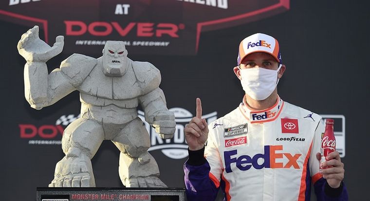 Denny Hamlin se anotó su sexta victoria de la temporada 2020 el sábado en la Drydene 311, la primera carrera de la doble cartelera del fin de semana de la NASCAR Cup Series y se llevó como premio la estatuilla del monstruo 'tragamillas', réplica de la que preside el ingreso en el Dover International Speedway.