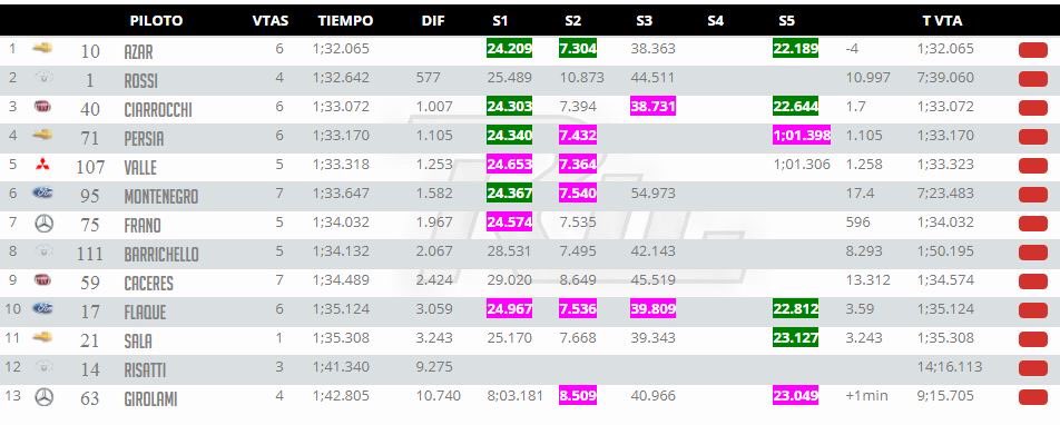 Por su parte, el cordobés de Almafuerte, Marcelo Ciarrocchi con el Fiat del “Equipo Octanos”, cerró una buena jornada al quedar en tercer lugar a 1”007/1000 de la referencia. Su coterráneo Ricardo Risatti (Camry) fue 11º.