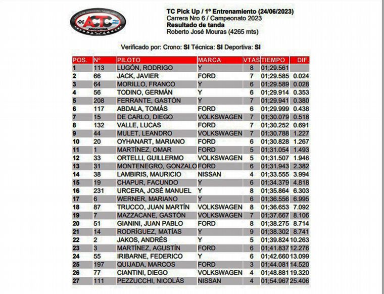 En el "Día del Piloto" en Argentina, Rodrigo Lugón, el oriundo de Villa Allende, Córdoba, sobre la Hilux #113 logró marcar 1’29”561/1000 para la mejor de las 8 vueltas dadas en el “Roberto Mouras” de La Plata, donde este fin de semana con la sexta fecha, se cumplirá la mitad del campeonato.