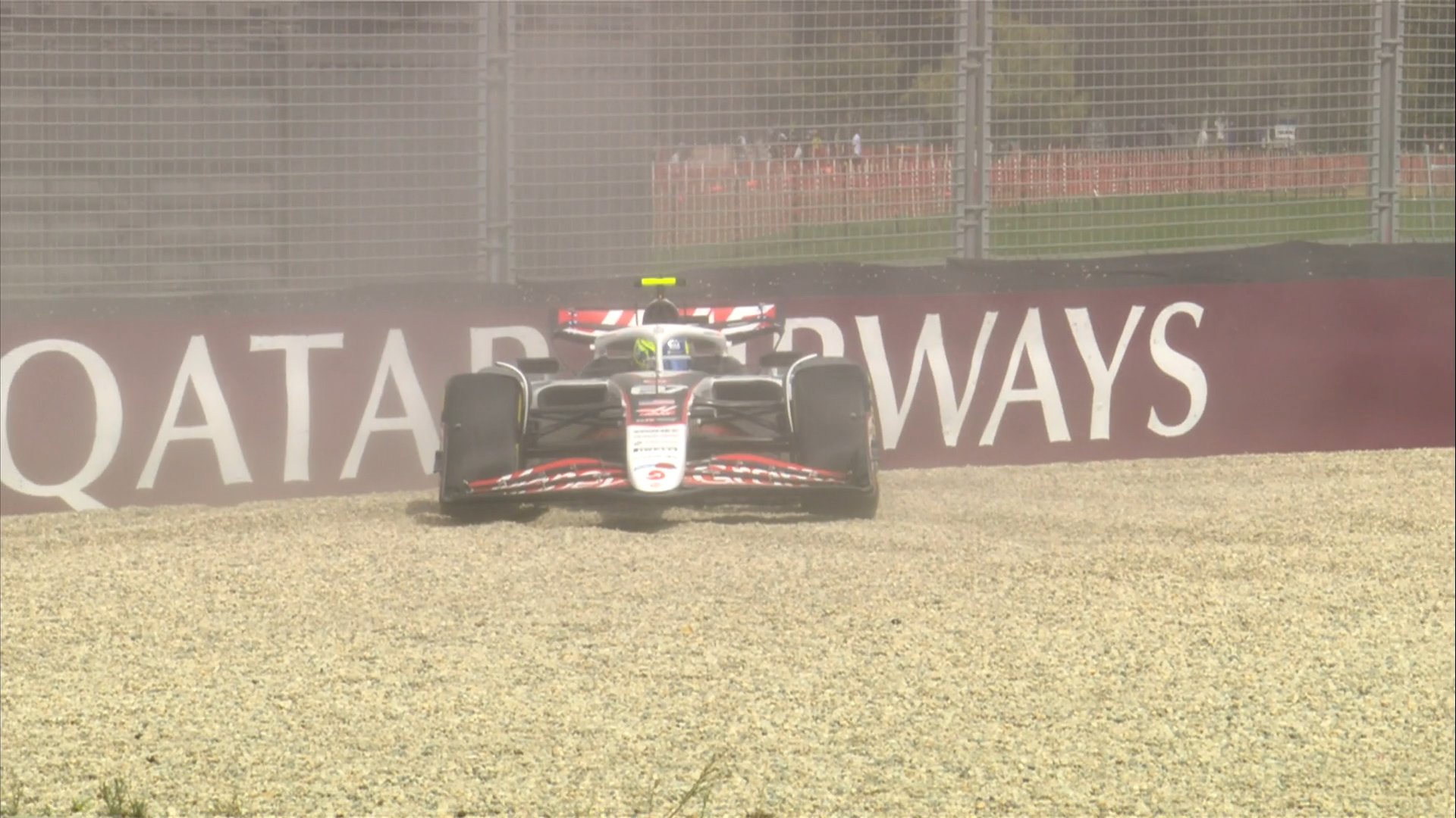 Las repeticiones mostraron a Bearman hundiendo un par de ruedas en la hierba al frenar en la curva 11, lo que provocó un trompo brusco y lo dejó atrapado en la grava. El británico y sus mecánicos negaron con la cabeza, expresando su frustración.