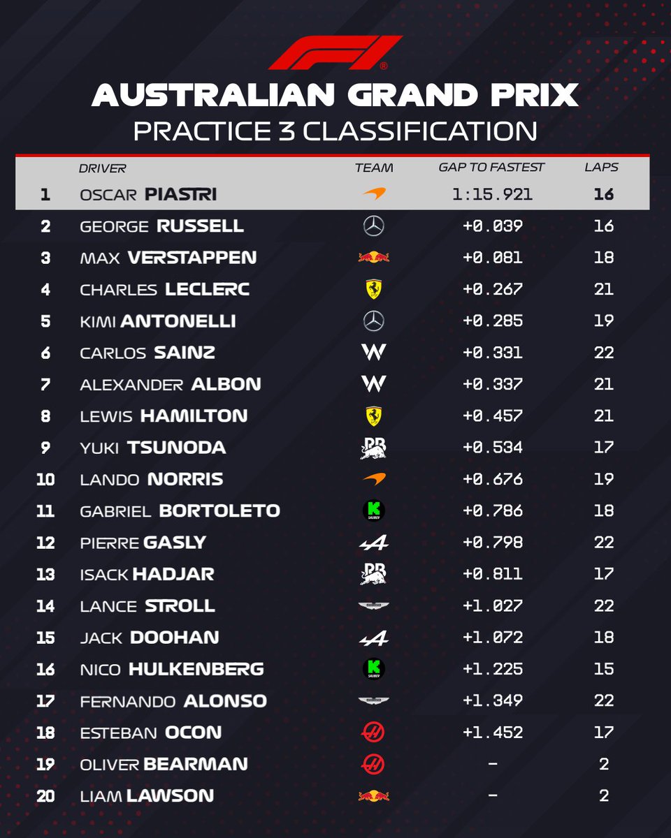 El piloto de McLaren, Oscar Piastri, marcó el mejor tiempo durante los últimos entrenamientos del Gran Premio de Australia de Fórmula 1, liderando la Práctica Libre 3 por delante de George Russell (Mercedes), Max Verstappen (Red Bull) y Charles Lecler (Ferrari). El novato de Haas, Ollie Bearman, sufrió su segundo despiste del fin de semana, a minutos del comienzo.