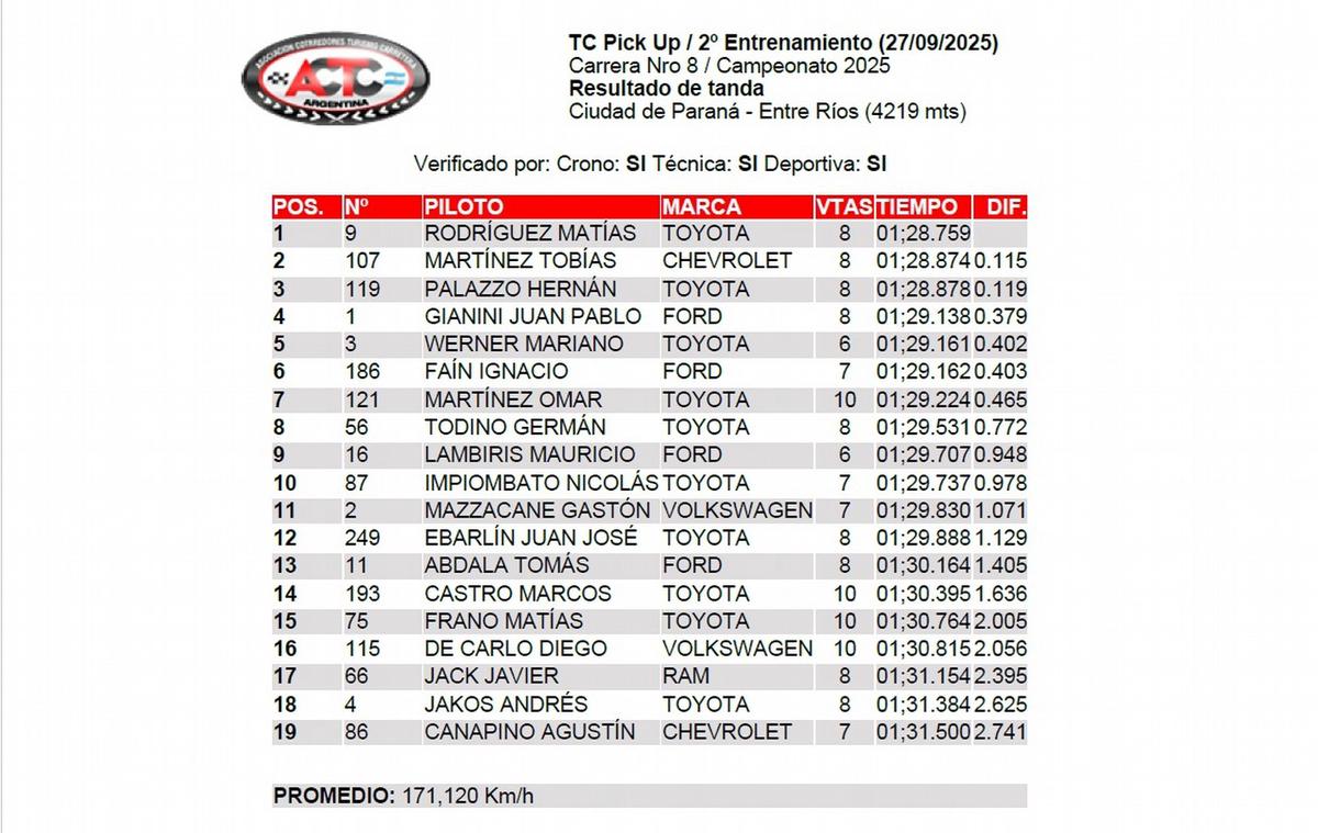 Matías Rodríguez, a bordo de la Toyota Hilux #9, volvió a ser el más rápido en el 2° Entrenamiento del TC Pick Up en el Autódromo de Paraná -4.219 mts.- que esté fin de semana disputa la apertura de la Copa de Oro 'Shell V Power'. Superó a Tobías Martínez -Chevrolet-, Hernán Palazzo -Toyota-, Juan Pablo Gianini -Ford- y Mariano Werner -Toyota-, que completaron el Top 5.