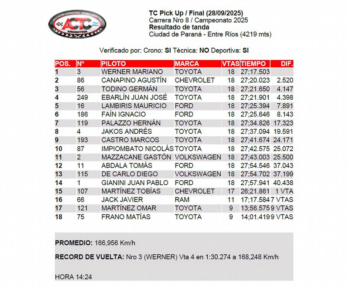 La carrera no tuvo más incidencias. El calor y el 'grip' comprometido con el que corren las camionetas las vueltas finales, les aconsejaron a los pilotos ser cautos y volver a casa con lo cosechado, por lo que la bandera final, encontró a: Werner, Canapino, Todino, Ebarlín, Lambiris, Faín, Palazzo, Jakos, Castro, Impiombato, Mazzacane, Abdala, De Carlo y Tobías Martínez.