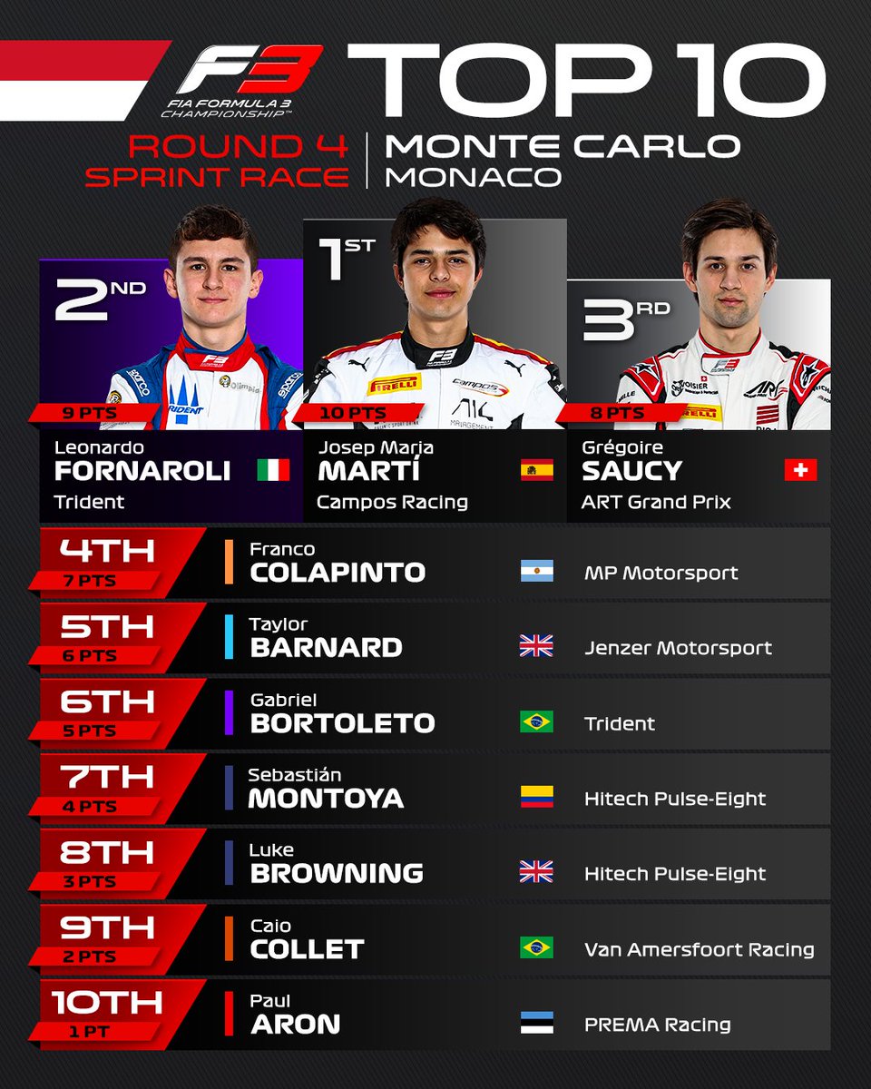 En el día de su cumpleaños número 20, el piloto argentino Franco Colapinto, con su Dallara-Mechacrome del MP Motorsport, consiguió un valioso 4° puesto en la Sprint Race de 23 vueltas -la primera carrera del fin de semana- de la Fórmula 3 FIA en el Gran Premio de Mónaco.