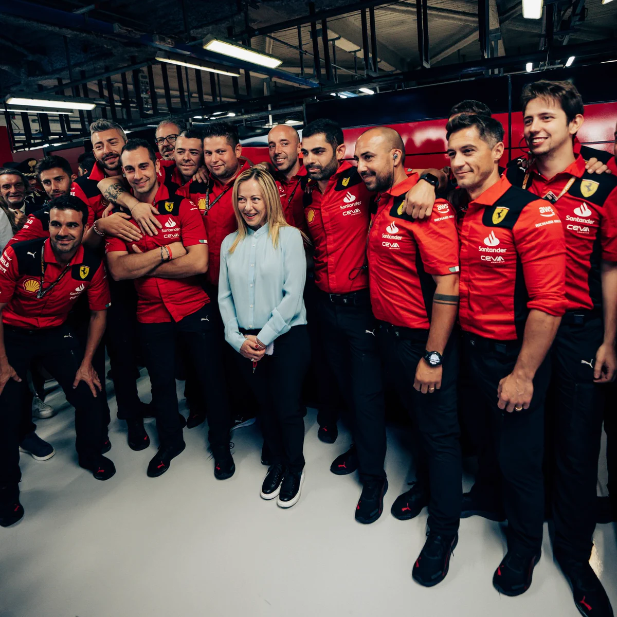 La presidente de Italia, Georgia Meloni, viviendo la 'Qualy' con los mecánicos de Ferrari