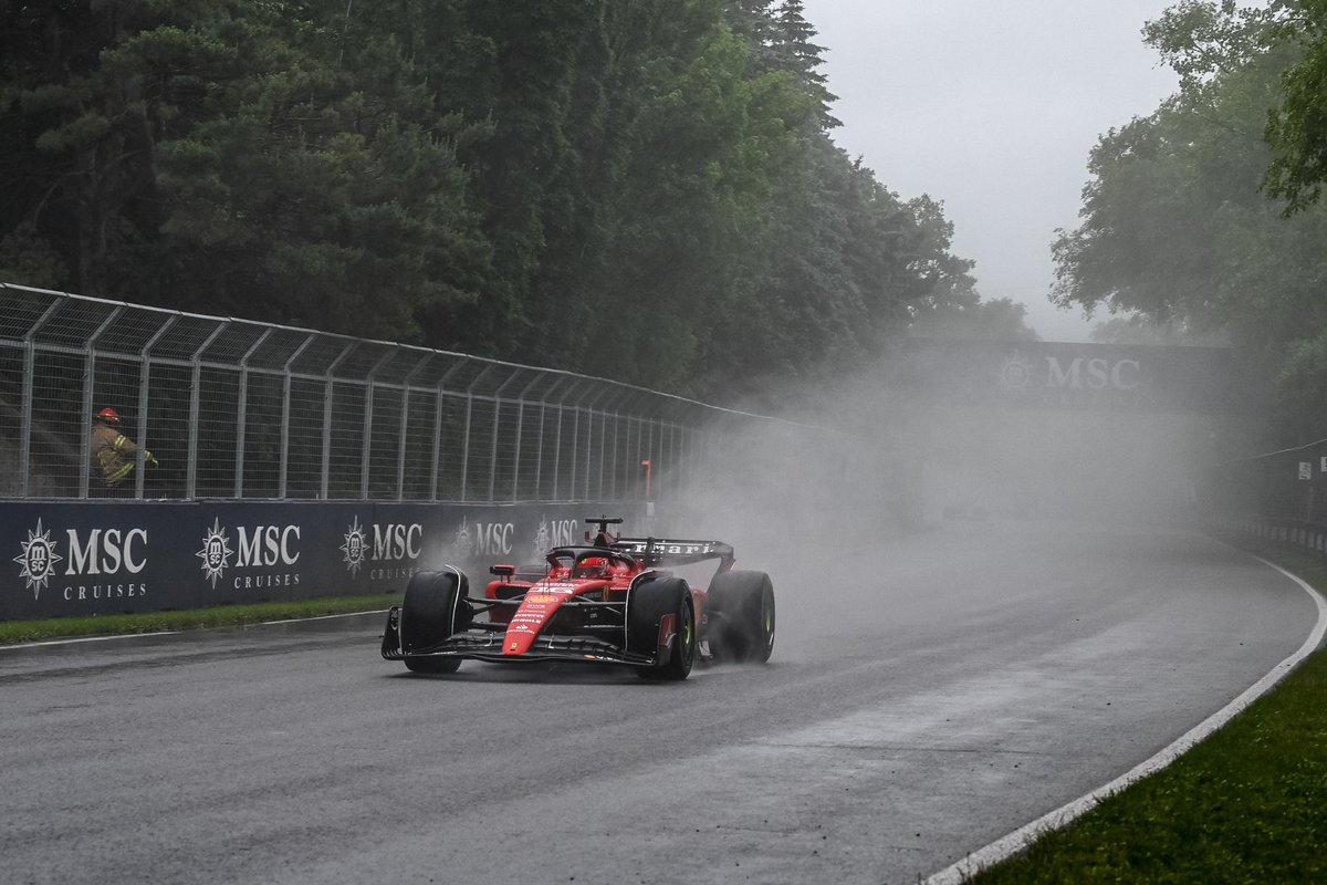 Después de un viernes mayormente seco, los pilotos fueron recibidos este sábado con una pista mojada mientras las fuertes lluvias continuaron cayendo en el área del 'Circuito Gilles Villeneuve' de 4.361 metros de extensión. Esto significó que los equipos optaron por equipar sus autos con neumáticos de lluvia extrema -marcados de azul, full wet- en las primeras etapas de la sesión.