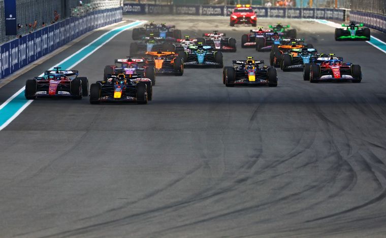 Verstappen defendió su P1 en la partida y la mantuvo tras el ingreso del Auto de Seguridad que ingresó en la vuelta siguiente, antes de asegurarse una cómoda ventaja en la punta, con Leclerc conformándose con el segundo lugar y Pérez luchando contra el rápido arranque Daniel Ricciardo que le había adelantado largando, para quedarse finalmente con el tercer lugar.