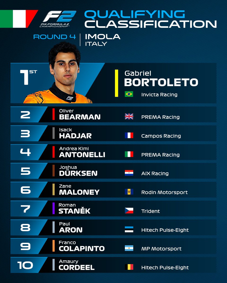El argentino Franco Colapinto clasificó 9° en la cuarta ronda del Campeonato 2024 de la FIA Fórmula 2, que corre este fin de semana en el Autódromo 'Enzo y Dino Ferrari' de Imola, Italia, junto a la F1. El poleman fue el brasileño Gabriel Bortoleto.