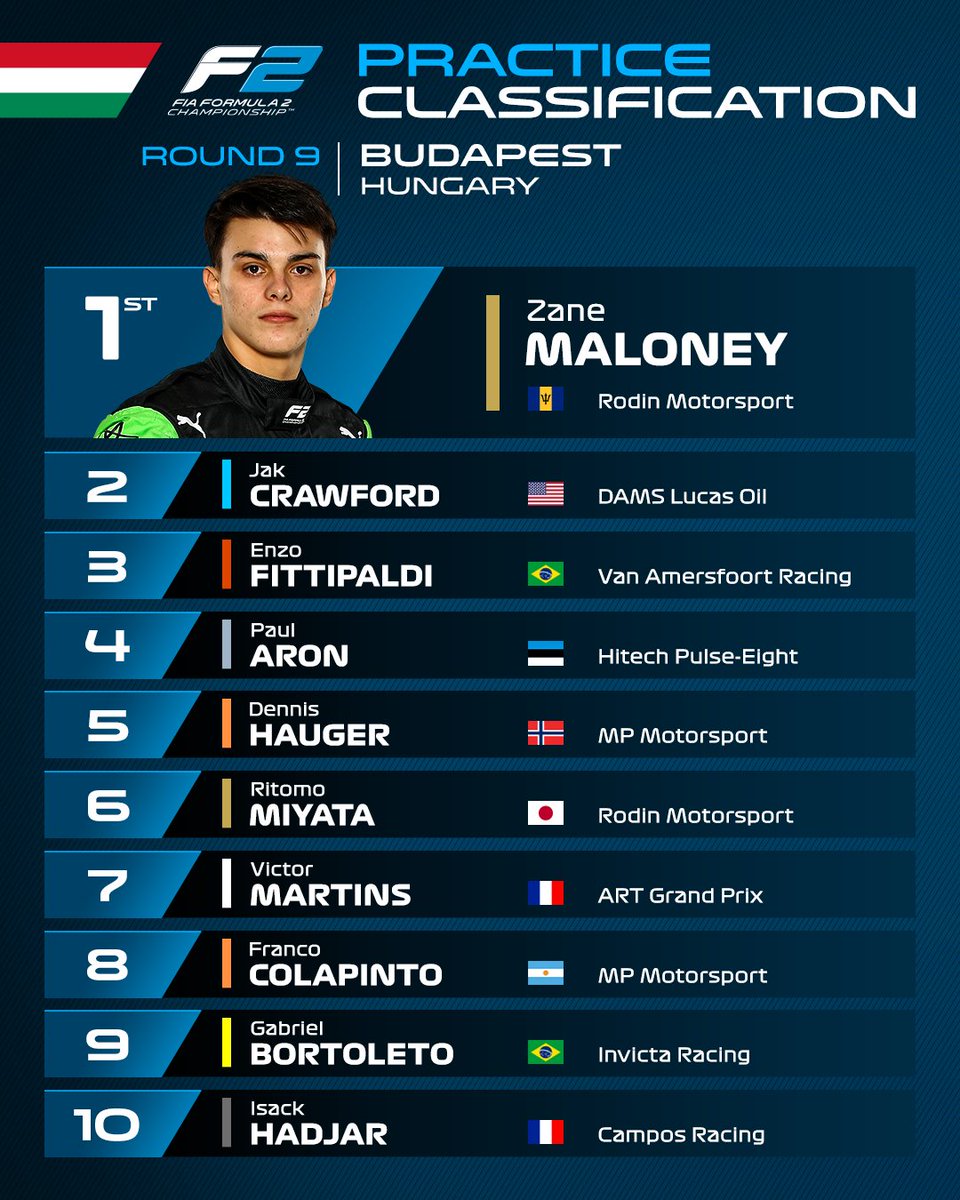 Maloney estuvo en buena forma durante toda la sesión y terminó siendo una décima más rápido que el estadounidense Jak Crawford de DAMS, quien quedó en segundo lugar y el brasileño Enzo Fittipaldi de Van Amersfoort Racing en tercer lugar.