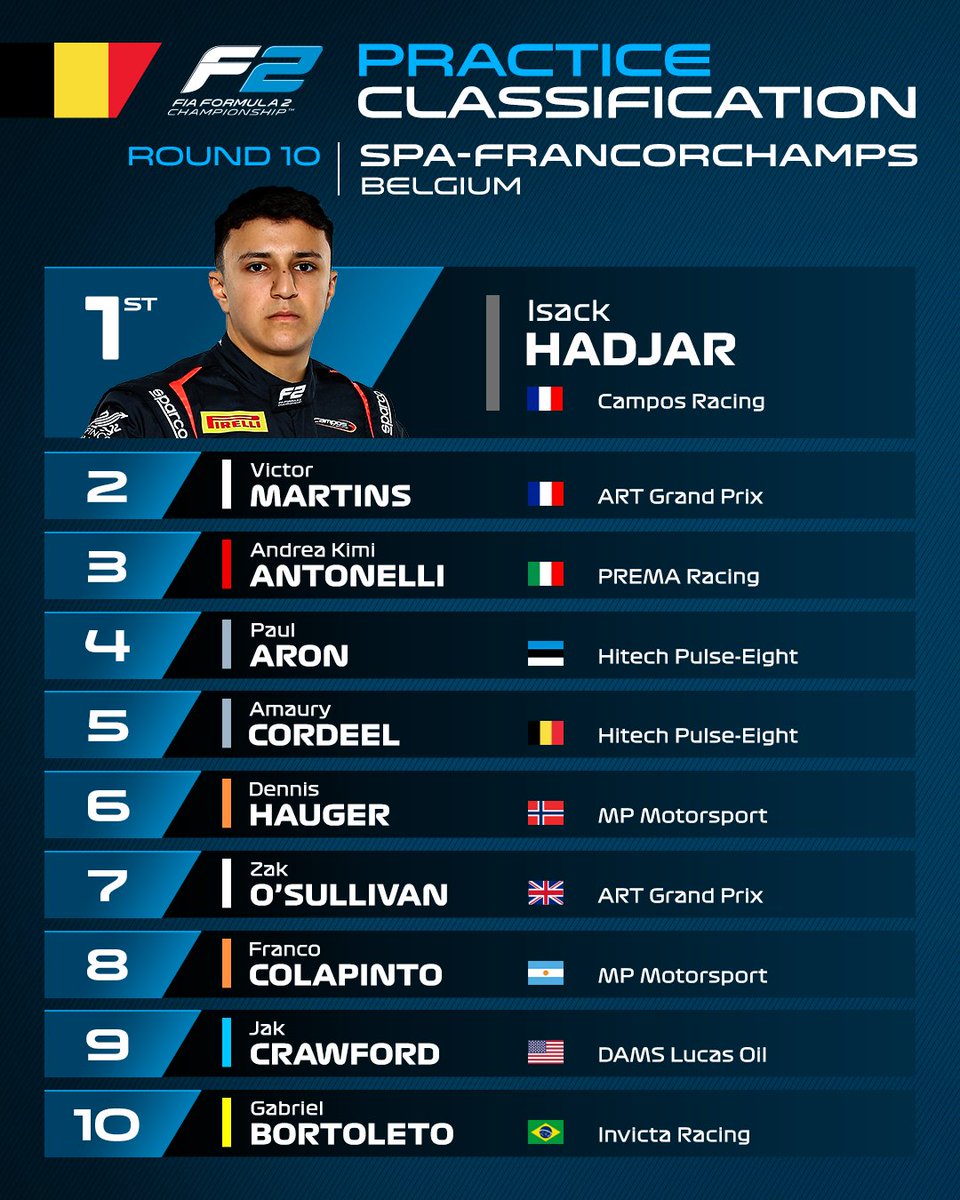 Detrás de Hadjar, se ubicaron Victor Martins -ART- +0.010, Andrea Kimi Antonelli -Prema- +0.437, Paul Aron -Hitech- +0.584 y Amaury Cordeel -Hitech- +0.638, en los cinco primeros lugares.