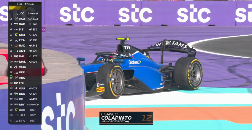 Tras el Auto de Seguridad que salió para el retiro del coche del Campos Racing, Franco perdió una posición con el puntero del certamen Zak Maloney y comenzó a seguirlo para avanzar. Cuando el de Barbados superó al francés Victor Martins de ART Grand Prix, el piloto de Pilar comenzó a atacar con el mismo próposito. No le fue tan sencillo, sin embargo. Y demoró más de dos vueltas para poder conseguirlo, usando el DRS en la recta principal.