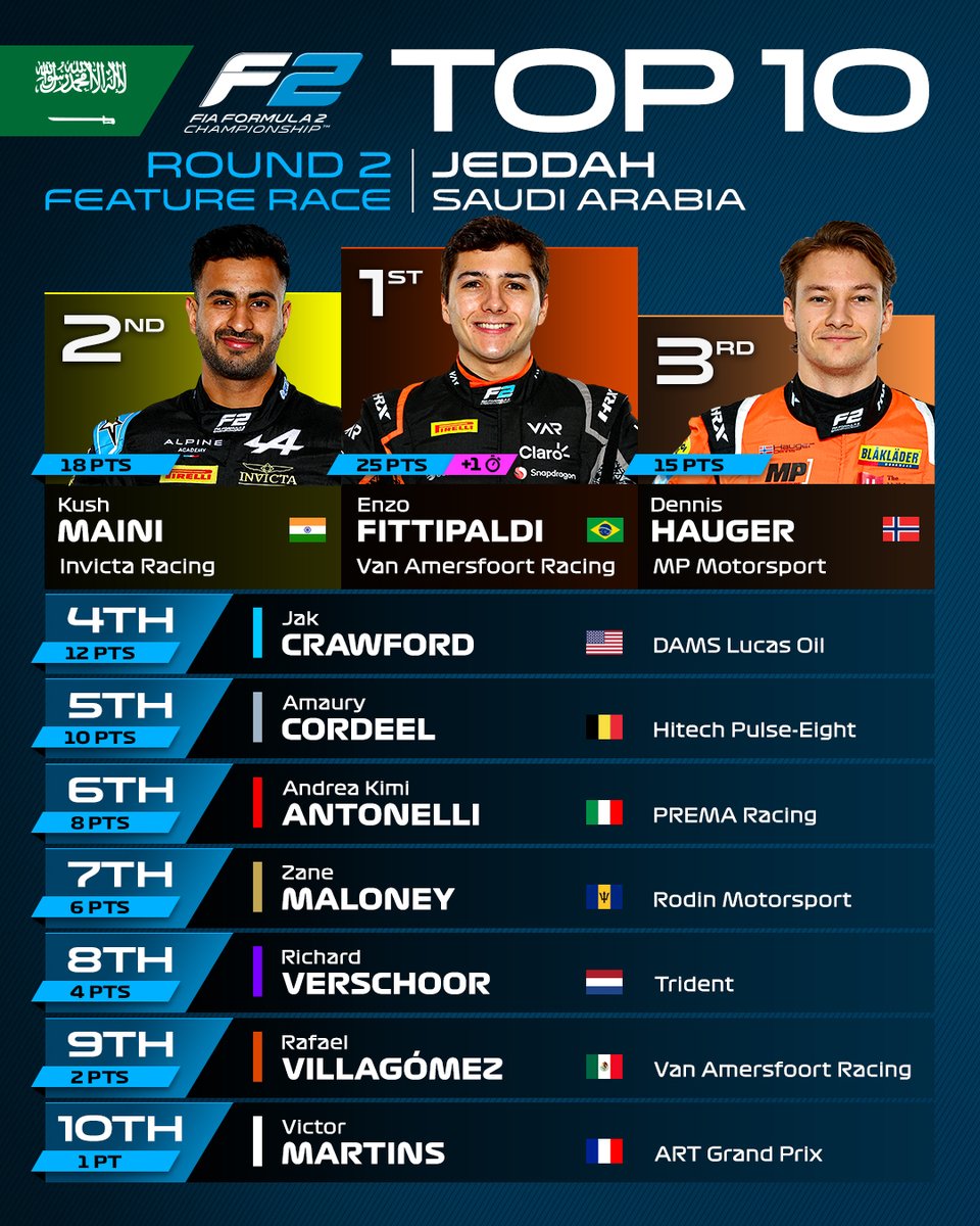 Franco Colapinto desertó de la Carrera Principal de la Ronda 2 del Campeonato de Fórmula 2 de la FIA, en el 'Circuito Internacional Jeddah Corniche', que fue ganada por el brasileño Enzo Fittipaldi del Van Amersfort Racing.