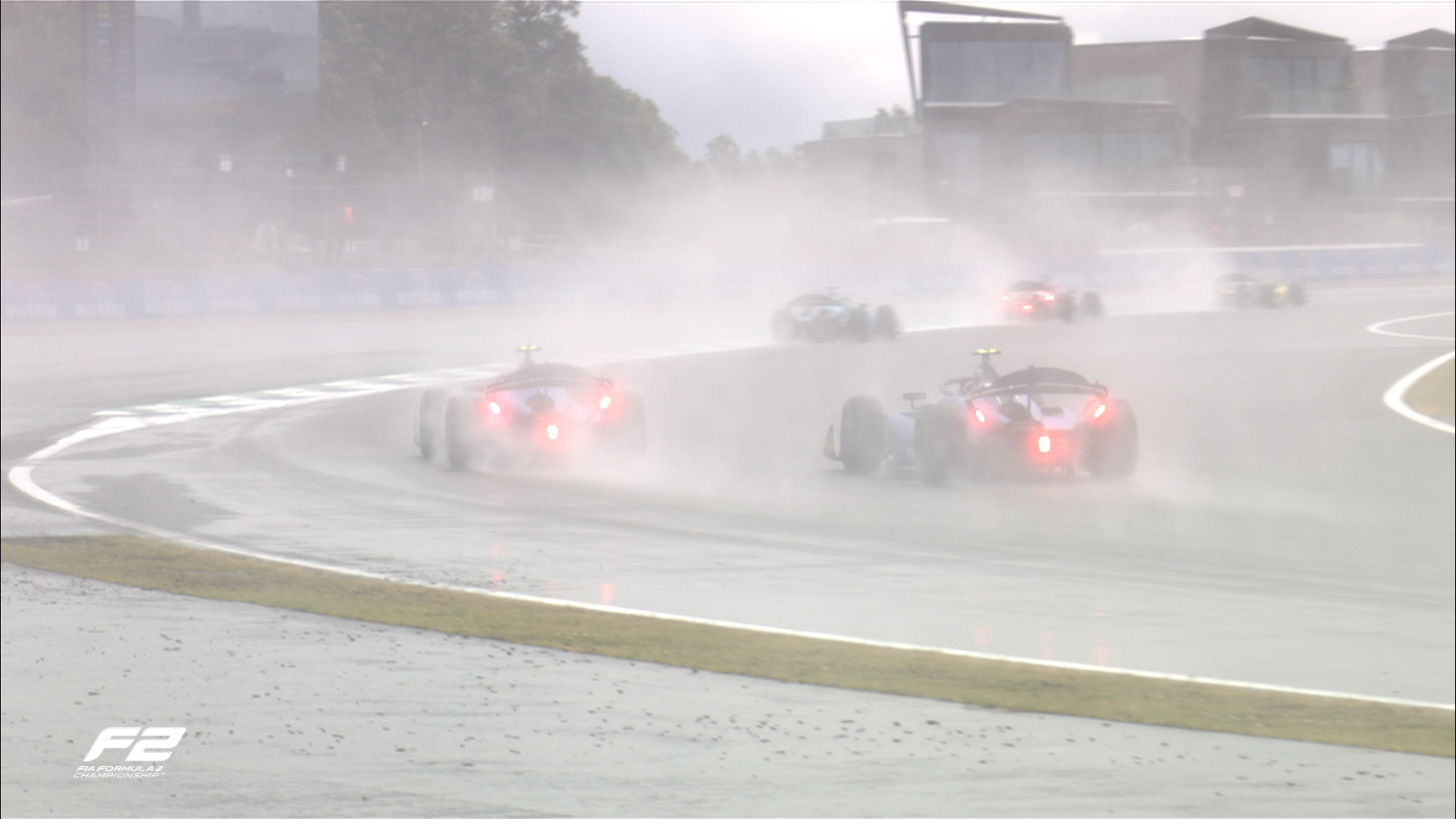 Después de una vuelta de formación detrás del coche de seguridad, la carrera tuvo un ritmo rápido y una lluvia intensa que se acercó rápidamente. Antonelli mantuvo su liderazgo, pero su compañero de equipo Oliver Bearman luchaba contra Gabriel Bortoleto en las primeras curvas y ambos hicieron un ligero contacto, dejando al británico con una placa terminal del alerón delantero rota en la lucha por el quinto lugar.