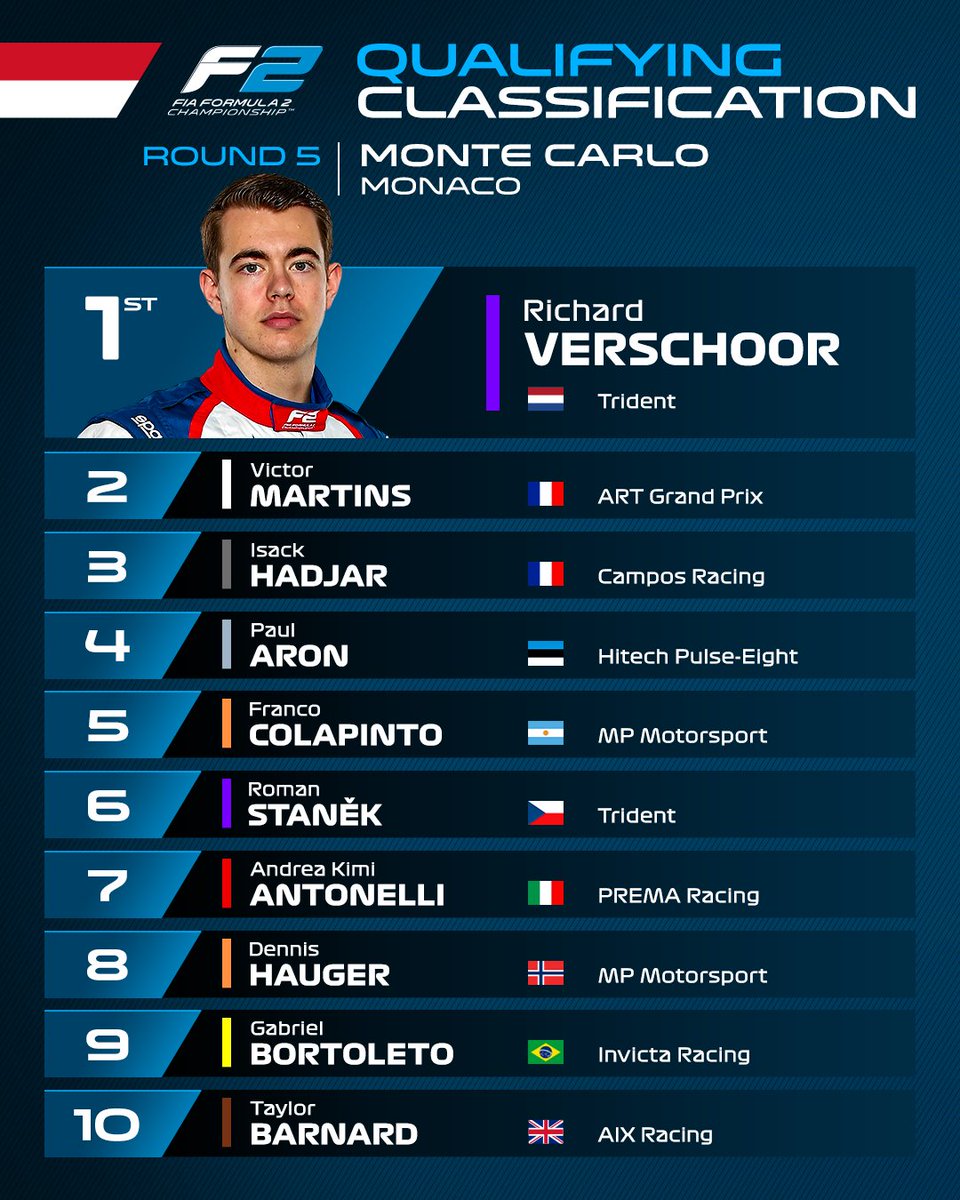 El argentino Franco Colapinto resultó 5° en las pruebas de clasificación de la Ronda 5 de FIA Fórmula 2 que corre este fin de semana en las calles de Montecarlo, junto al Gran Premio de Mónaco de F1. El neerlandés Richard Verschoor del equipo Trident fue el poleman.