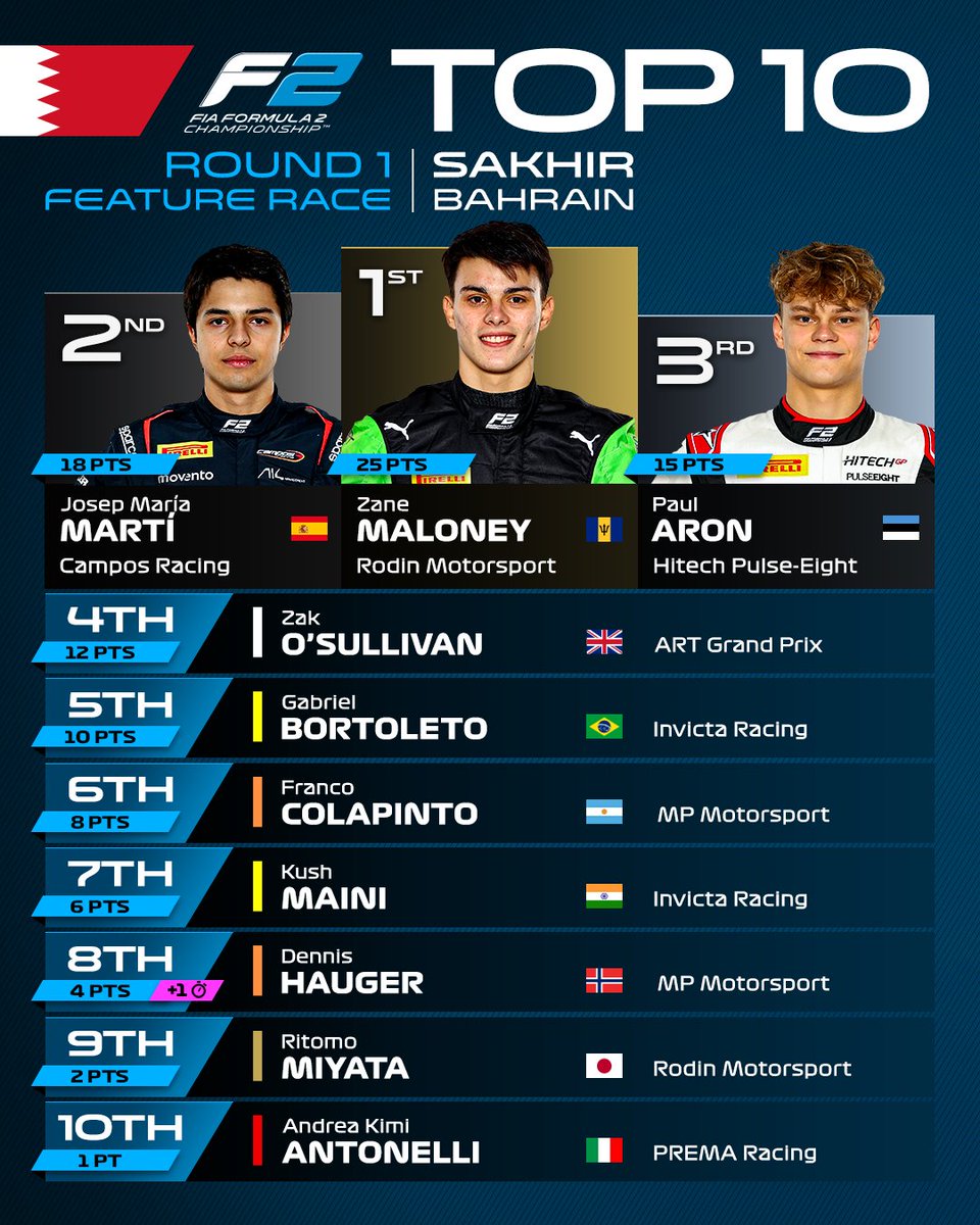 Maloney fue un vencedor inalcanzable, seguido por el español del Campos Racing, Josep María Martí y el estonio Paul Aron de ART Grand Prix. Detrás de los del podio, quedaron Bortoleto, Colapinto, el indio Kush Maini, también de Invicta, que largó último. Hauger, el japonés Ritomo Miyata, de Rodin y la promesa italiana del Prema Racing, Andrea 'Kimi' Antonelli, cerrando los diez mejores puestos.
