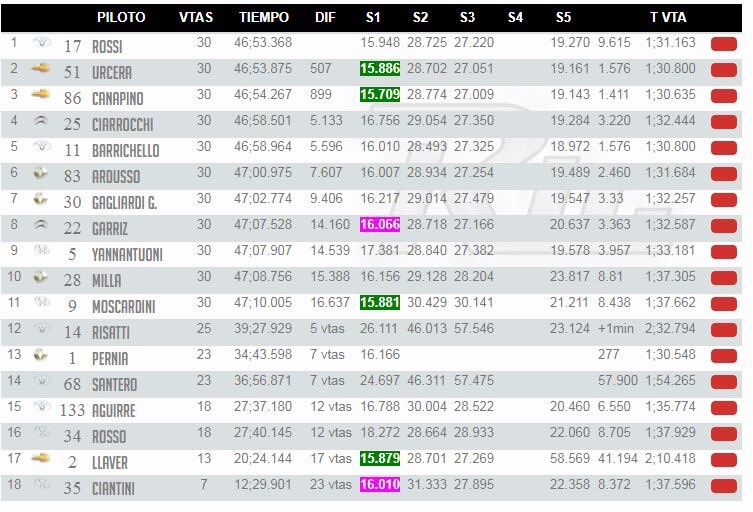 Campeonato actualizado: M.Rossi 159, A.Canapini 118, F.Ardusso 83, L.Pernía 75, R.Barrichello 53, R.Risatti 45, M.Milla 40.