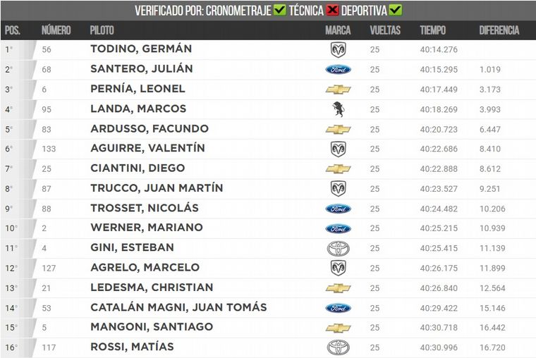 Segundo llegó Julián Santero , con Ford, a poco más de un segundo del ganador Todino. Leonel Pernía, con el mejor Chevrolet, ocupó el último escalón del podio. Cuarto arribó Marcos Landa con Torino para completar las cuatro marcas en los primeros cuatro lugares, en tanto que Facundo Ardusso, con Chevrolet terminó en la quinta posición.