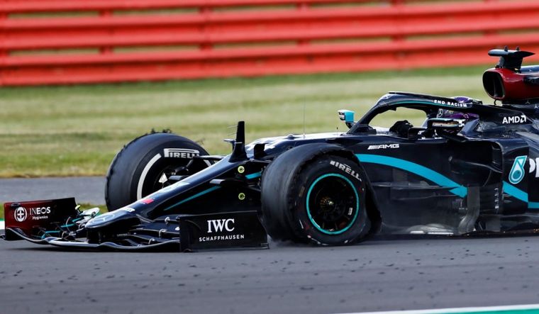 El inglés de Mercedes dominaba en Silverstone, pero una inesperada rotura de su delantera izquierda casi le hace perder la carrera en la última vuelta. Cruzó la meta dramáticamente con una goma menos.
