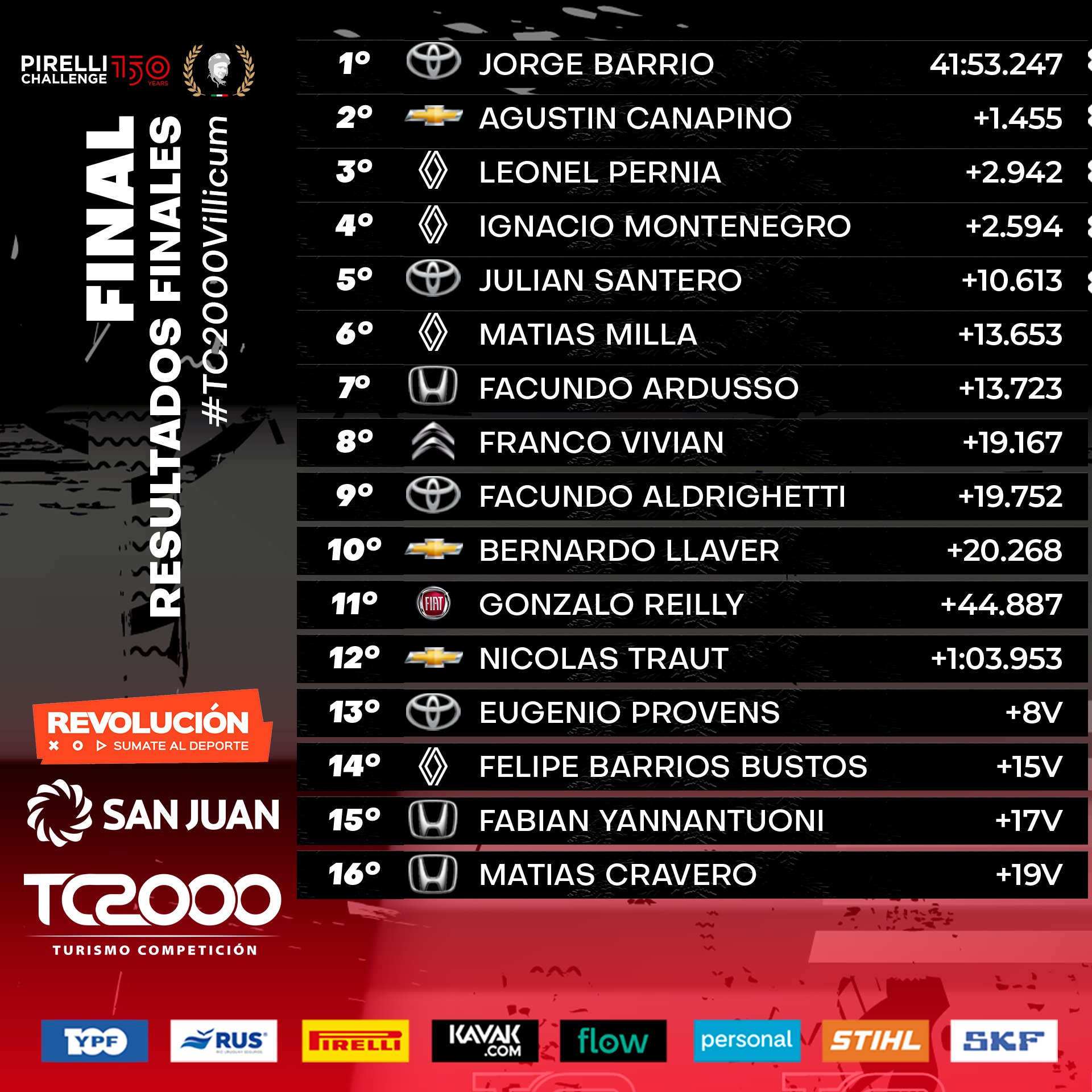 El final vio a Barrio que, a pesar de correr preocupado por el deterioro de sus gomas delanteras bloquedas, aseguró con firmeza la victoria sobre Canapino, Pernía, Montenegro, Santero, Milla, Ardusso, Vivian, Aldrighetti, Llaver, Reilly y Traut.