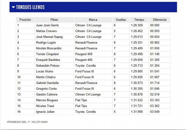 Juan José Gárriz del Citroën Team PSG hizo la mejor vuelta en la tanda de "Tanques Llenos" en el TC2000 de Olavarría. Lo escoltó su compañero Matías Cravero. Largan adelante la Final a las 12:05