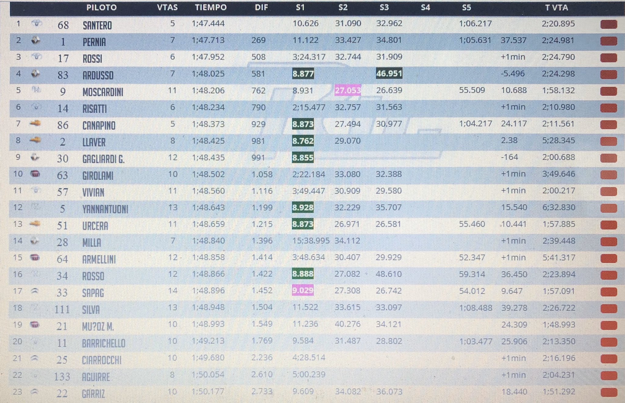 Ricardo Risatti con el Corolla del “Midas Racing” fue el mejor de los cordobeses a 790/1000, mientras que sus comprovincianos se ubicaron: 9º/Gagliardi Gene (Renault), 10º/F.Girolami (Fiat), 16º/J.A.Rosso (Honda) y 21º/M.Ciarrocchi (C4).