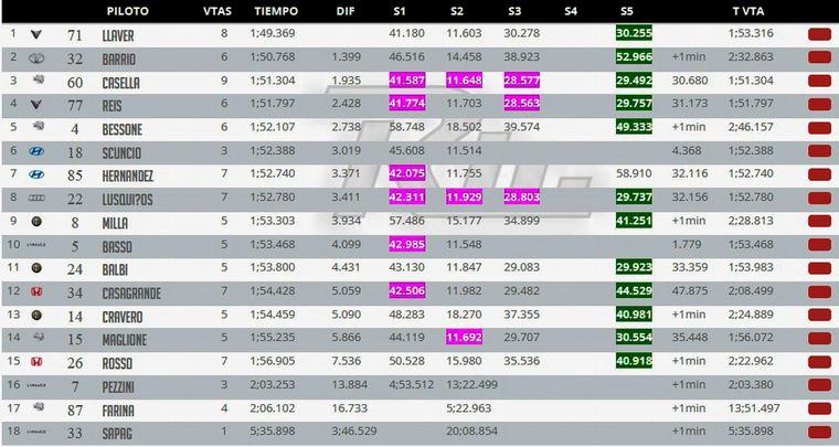 Respecto de los contendientes al título en la fecha cierre del año, el puntano Fabricio Pezzini con el Link & Co del PM Motorsport que lidera la suma de puntos fue 16° con solo tres giros, y Juan Angel Rosso con el Civic de la SQUADRA Martino, quedó en posición 15°. A las 17:00 será el Entrenamiento de 30’.