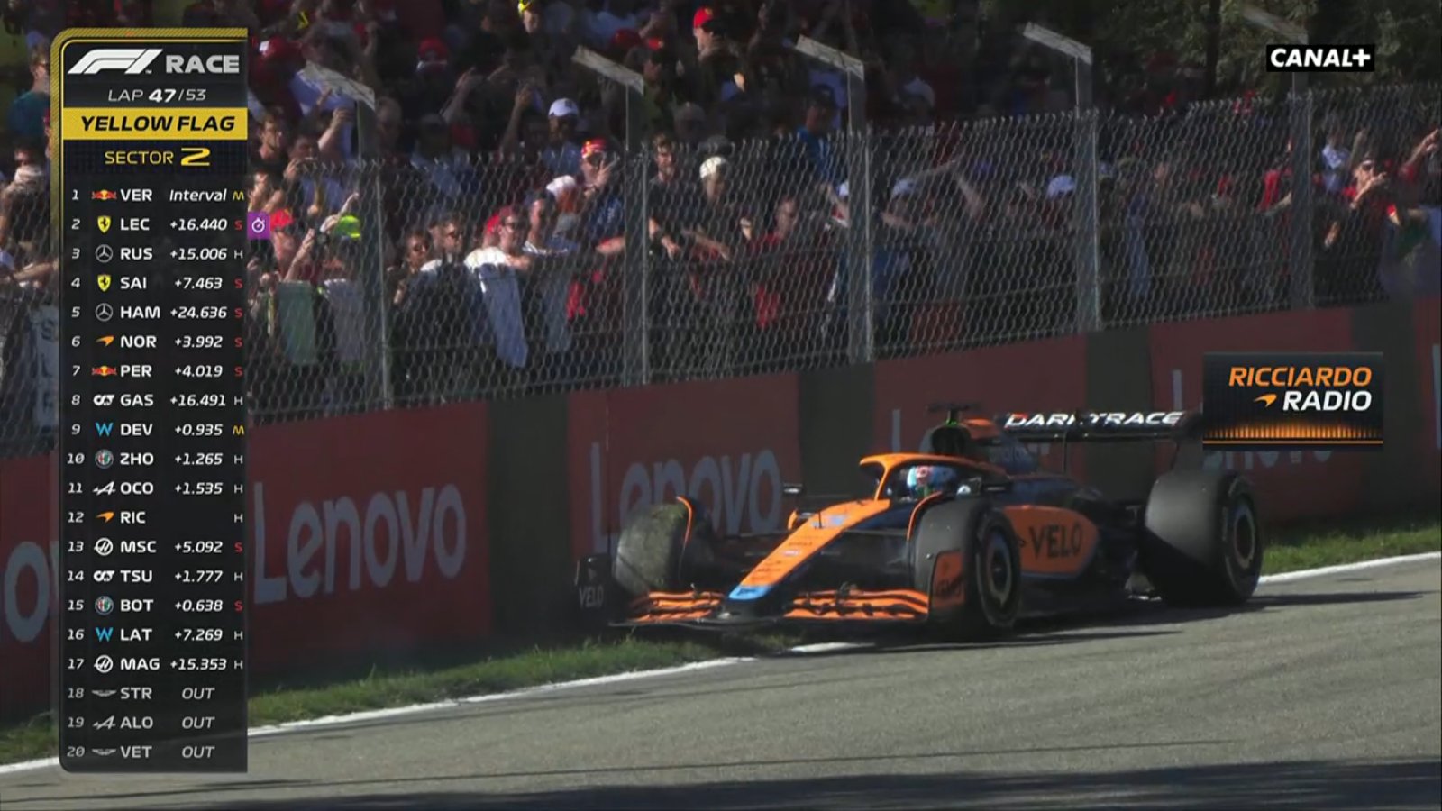 En el análisis del resto, entra una nueva frustración para 'la Scuderia' que, con su presidente John Elkkan en el box, vio como se esfumaba el sueño de victoria de su excelente piloto monegasco, porque simplemente no tuvo el ritmo para detener el avance del Red Bull #1. La impericia de comisarios y asistentes de pista para retirar el McLaren de Daniel Ricciardo detenido en camino a 'Lesmo', también le impidió a Charles Leclerc jugarse la carta heroica de un mano a mano con Max, en las vueltas finales. La carrera terminó con el pelotón siguiendo al Auto de Seguridad, mientras los tifosi defraudados silbaban.