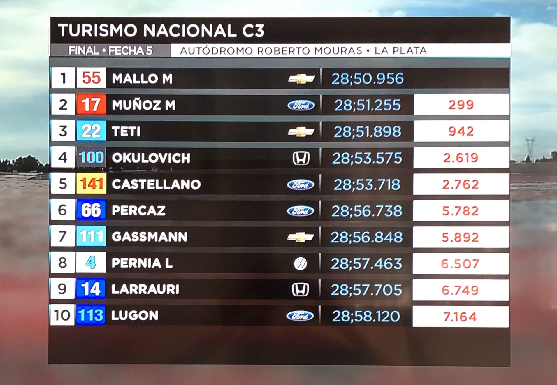 La faena de Mallo no tuvo fisuras, largó impecable, tomó el liderazgo con determinación y manejó el ritmo de la carrera, mas allá de la salida de un “Auto de Seguridad” que obligó a un relanzamiento a poco del final, donde por reglamento se agregaron dos giros mas (16).