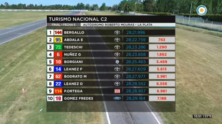 Con dos vueltas para correr una vez que los soltó el “Auto de Seguridad”, Tomás Bergallo (Etios) fue decididamente a la punta hasta encontrar la bandera de cuadros, seguido de Emanuel Abdala y Tedeschi, todos con Etios también.