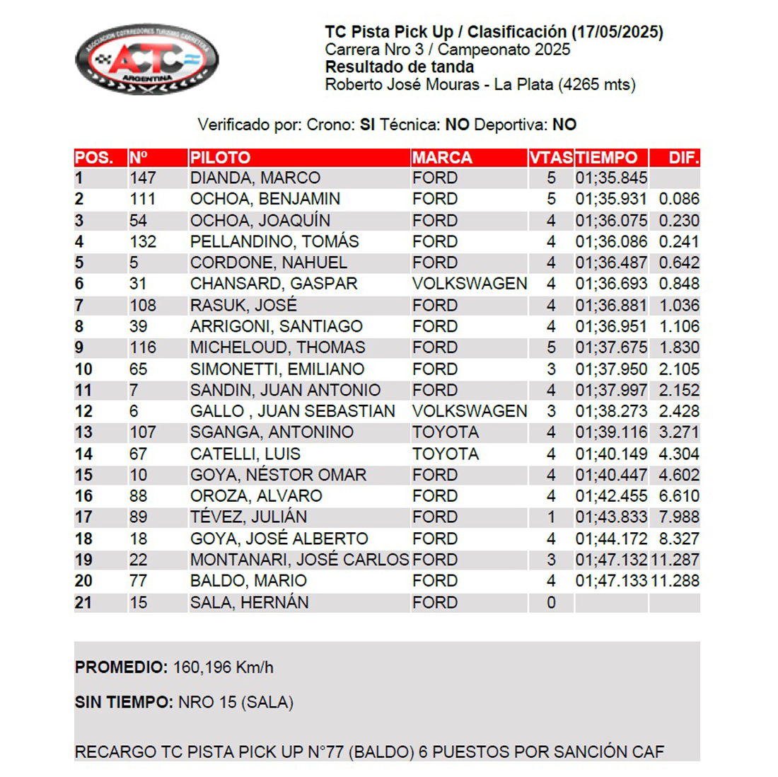 Dianda que se ubica sexto en el torneo de la presente temporada, logró marcar hoy 1’35”845/1000, para dejar detrás en una apretada clasificación a Benjamín Ochoa (Ranger) por 086/1000 y a Joaquín Ochoa (Ranger) por 230/1000.