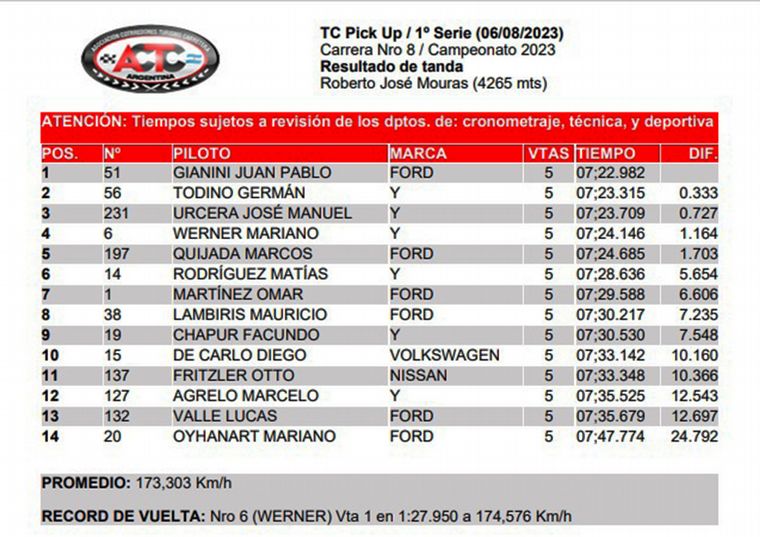 Juan Pablo Gianini con la Ford Ranger de la “Raza Fuerte” ganó de manera impecable la primera de las series del TC Pick Up en La Plata, la que terminó siendo la mas rápida de la mañana y le permite al tri-campeón de la categoría largar en primera fila y del lado de la cuerda la la final a las 13:45. Germán Todino (Hilux) y José Manuel Urcera (Hilux) lo escoltaron. Facundo Chapur, piloto “Hamilton Herramientas” arribó 9°.