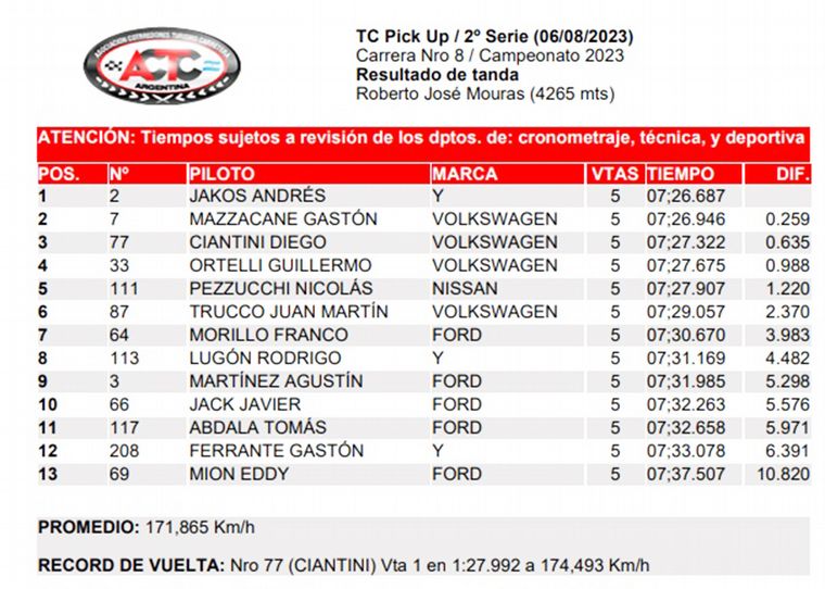 TC PICK UP/Cronograma-Horarios: Domingo 6/Agosto: 13:45-Final.