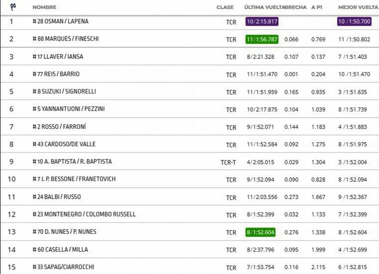 Los argentinos Facundo Márques (Río Cuarto) y Damián Fineschi con un Peugeot 308 del “PMO Racing”, fueron los mas cercanos a los líderes, al quedar a solo 103/1000 de diferencia. Por su parte, los integrantes del “Toyota Team Argentina”, con el Corolla #17, Bernardo Llaver y Gastón Iansa, completaron el terceto de adelante, pero a 703/1000.