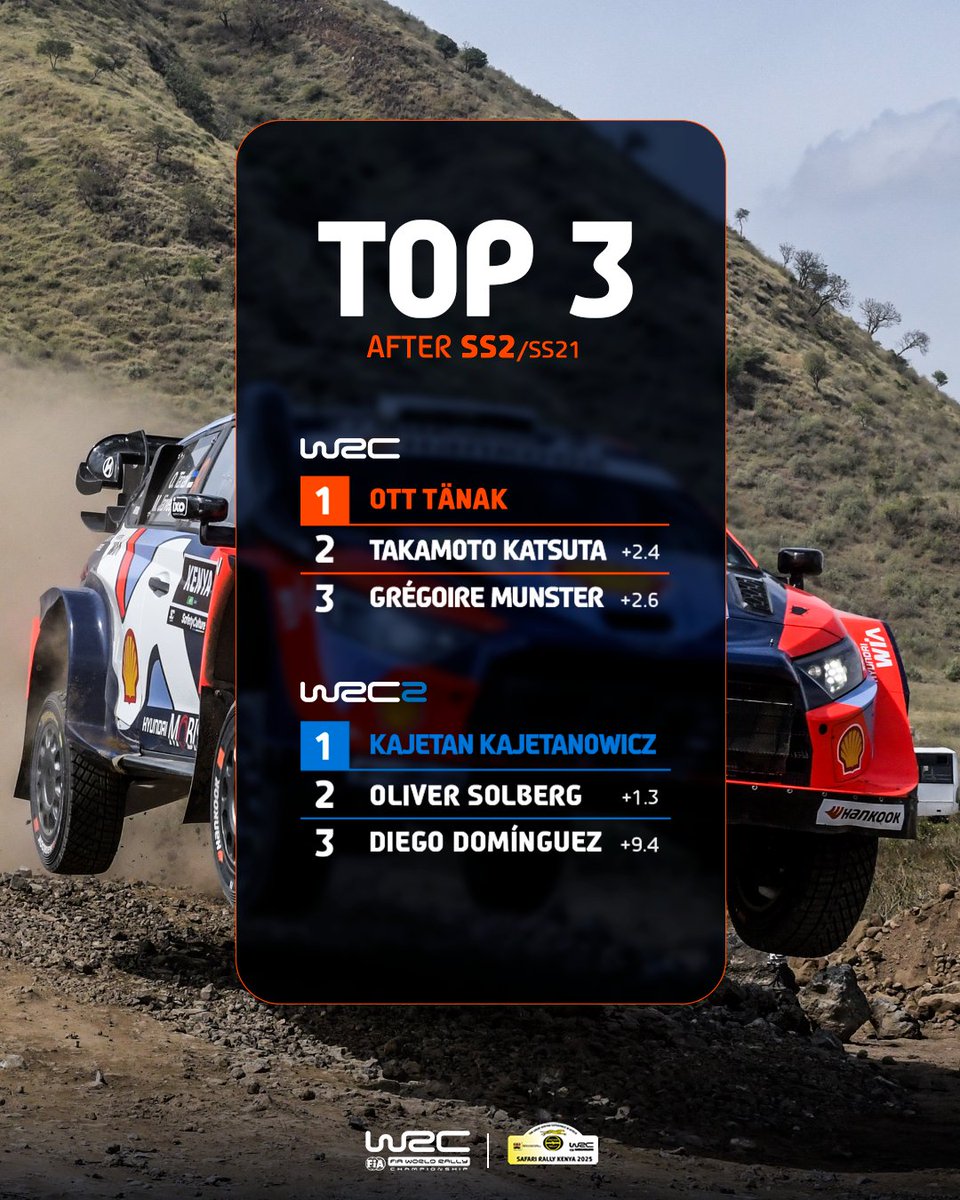 El presidente William Ruto, inauguró oficialmente hoy el capítulo africano del WRC. El estonio encabeza los tiempos, potergando a Katsuta -Toyota- y Munster -Ford- tras las dos primeras pruebas.