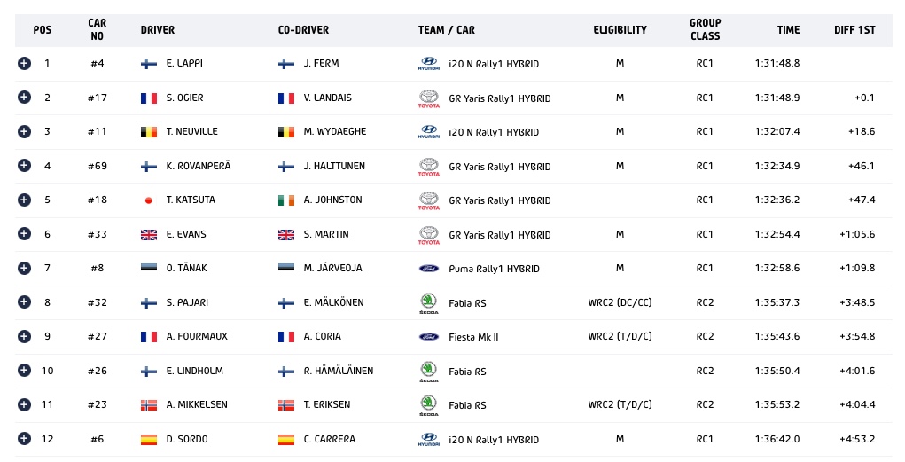 Los pilotos de WRC2 Adrien Fourmaux y Andreas Mikkelsen fueron octavo y noveno respectivamente, mientras que Dani Sordo completó el top 10. El español volcó su Hyundai en el TC4, perdiendo más de tres minutos.