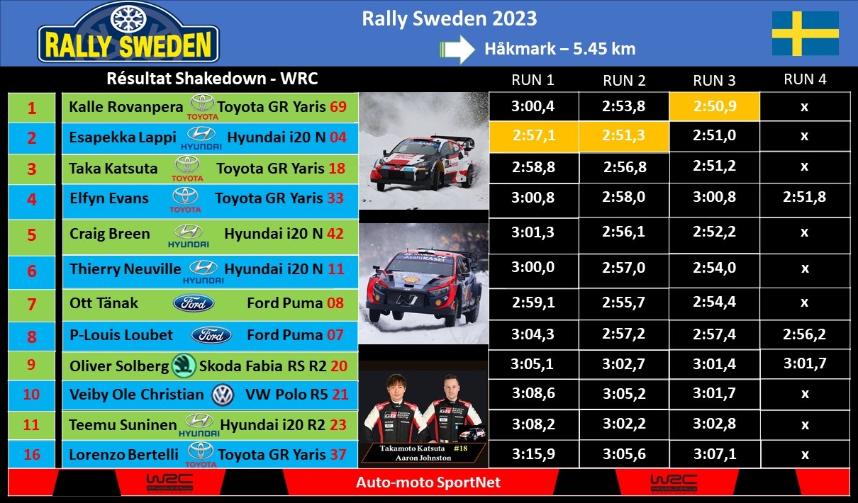 El finlandés campeón mundial, Kalle Rovanperä superó los 5,45 km del tramos de Håkmark, cerca de la base de Umeå de la prueba, a una velocidad media de 115 km/h en su Toyota GR Yaris Rally1 de propulsión híbrida, superando a Esapekka Lappi de Hyundai por sólo una décima de segundo en su tercera y última pasada.