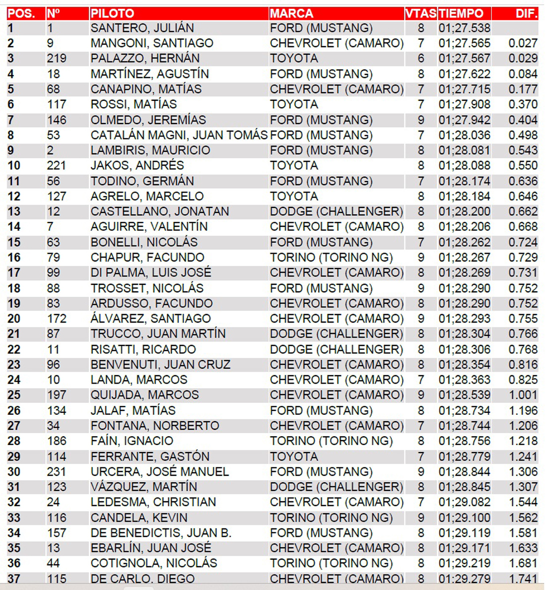 Julián Santero con el Ford Mustang #1 giró en 8 oportunidades en el primer entrenamiento del Turismo Carretera donde registró en su mejor paso 1’27”538/1000, doblegando a Santiago Mangoni con el mejor de los Chevrolet Camaro por 027/1000.
