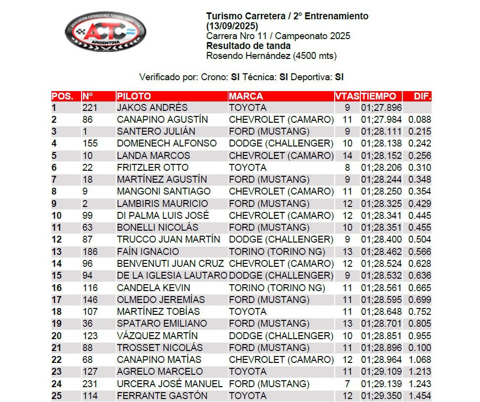 Andrés Jakos con el Toyota Camry #221 ganó el segundo entrenamiento en el Autódromo "Rosendo Hernández" de la ciudad de San Luis. Canapino (Camaro) y el actual campeón Santero (Mustang) lo escoltaron. Se viene la clasificación desde las 16:03.