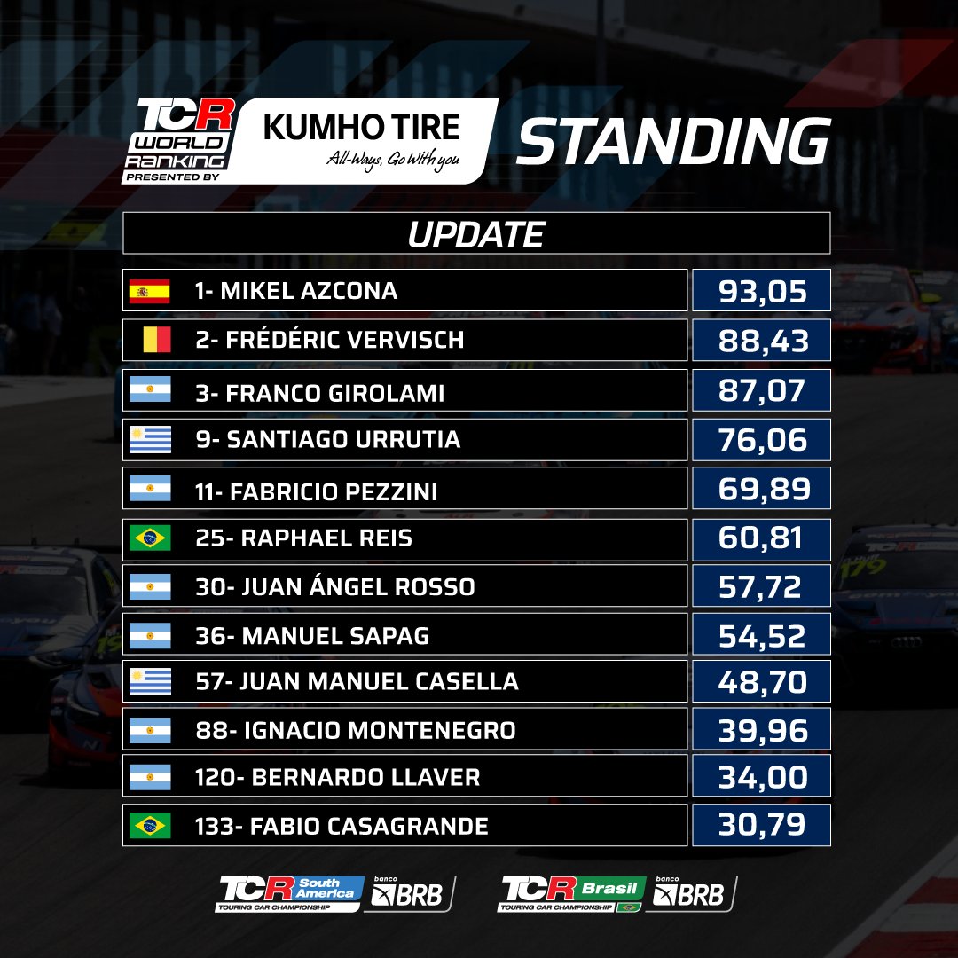 Los primeros tres ya son conocidos en la cima del ranking. En el primer lugar, por España, aparece Mikel Azcona que fue el último campeón del WTCR. Por detrás, representando a Bélgica, está Frédéric Vervisch y último escalón del “top 3” es para el argentino Franco Girolami. El francés Yann Ehrlacher es el cuarto colocado y el quinto es el chino Ma Qing Hua que suma puntos del TCR WORLD TOUR, el WTCR y el TCR Asia.