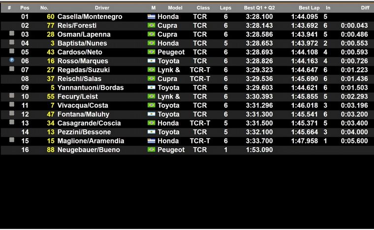 Con un gran trabajo combinado en las dos tandas de 15' -Q1 Invitados y Q2 Titulares-, el uruguayo y el argentino se impusieron sobre los Cupra del W2 Pro GP de Raphael Reis-Lucas Foresti +0.043 y Galid Osman-Felipe Lapenna +0.486. En el cuarto lugar, quedó otra máquina de Sebastián Martino, el Civic #03 de Rodrigo Baptista-Diego Nunes +0.553 y Pedro Cardoso-Celso Neto +0.593 cerraron el Top 5 con el Peugeot 308 TCR que ahora atiende en Brasil la estructura Full Time Sports.