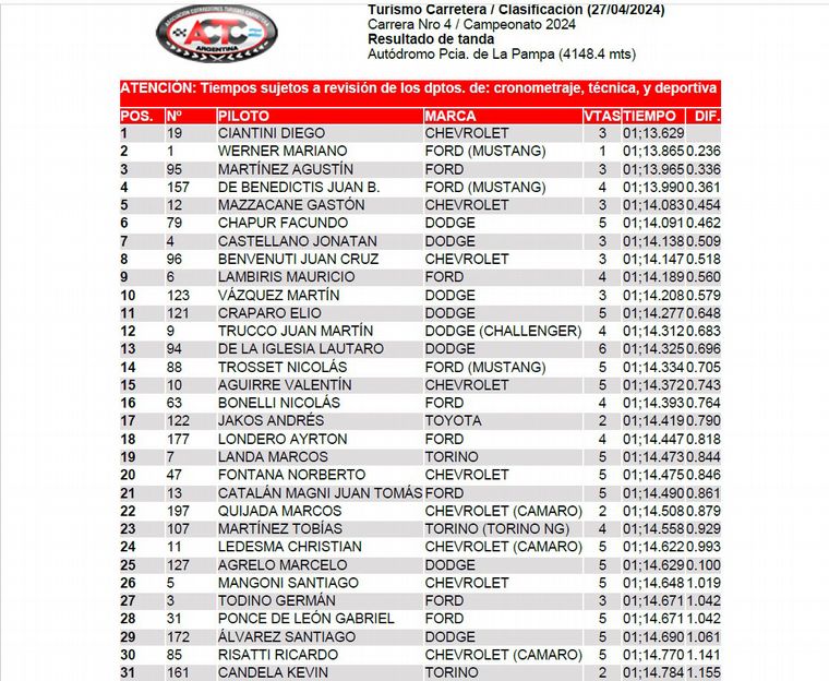 En resumen, la clasificación fue para Ciantini 1.13.629, seguido por Werner +0.236, Agustín Martínez -Falcon- +0.336, Juan De Benedictis -Mustang- +0.361, Gastón Mazzacane -Chevy- +0.454, Facundo Chapur -Dodge- +0.462, Jonatan Castellano -Dodge- +0.509, Juan Cruz Benvenuti -Chevy- +0.518, Mauricio Lambiris -Ford- +0.560 y Martín Vázquez -Dodge- +0.579, completando los diez mejores.