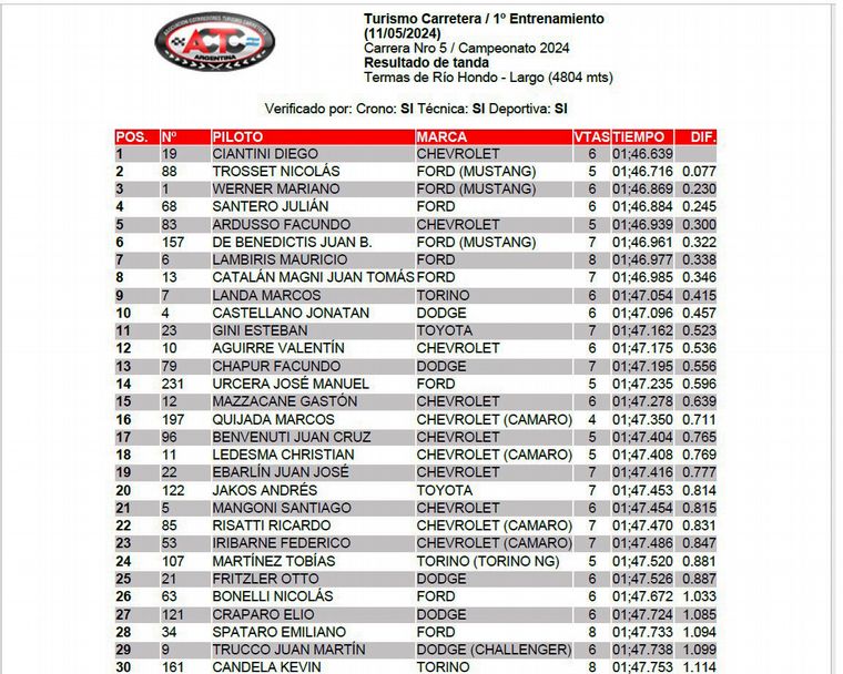 Juan De Benedictis -Mustang- +0.322, Mauricio Lambiris -Ford Falcon- +0.338, Juan Catalán Magni -Ford Falcon- +0.346, Marcos Landa -Torino- +0.415 y Jonatan Castellano -Dodge- +0.457, completaron los diez mejores puestos del ensayo.