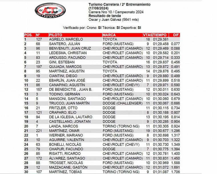 El chubutense de Rada Tilly, Marcelo Agrelo con el Toyota #127 dominó el #Entrenamiento2 con 1’29”381/1000, seguido de Julián Santero (Ford Mustang) a 077/1000 y Juan Cruz Benvenutti en el Chevrolet Camaro a 088/1000.