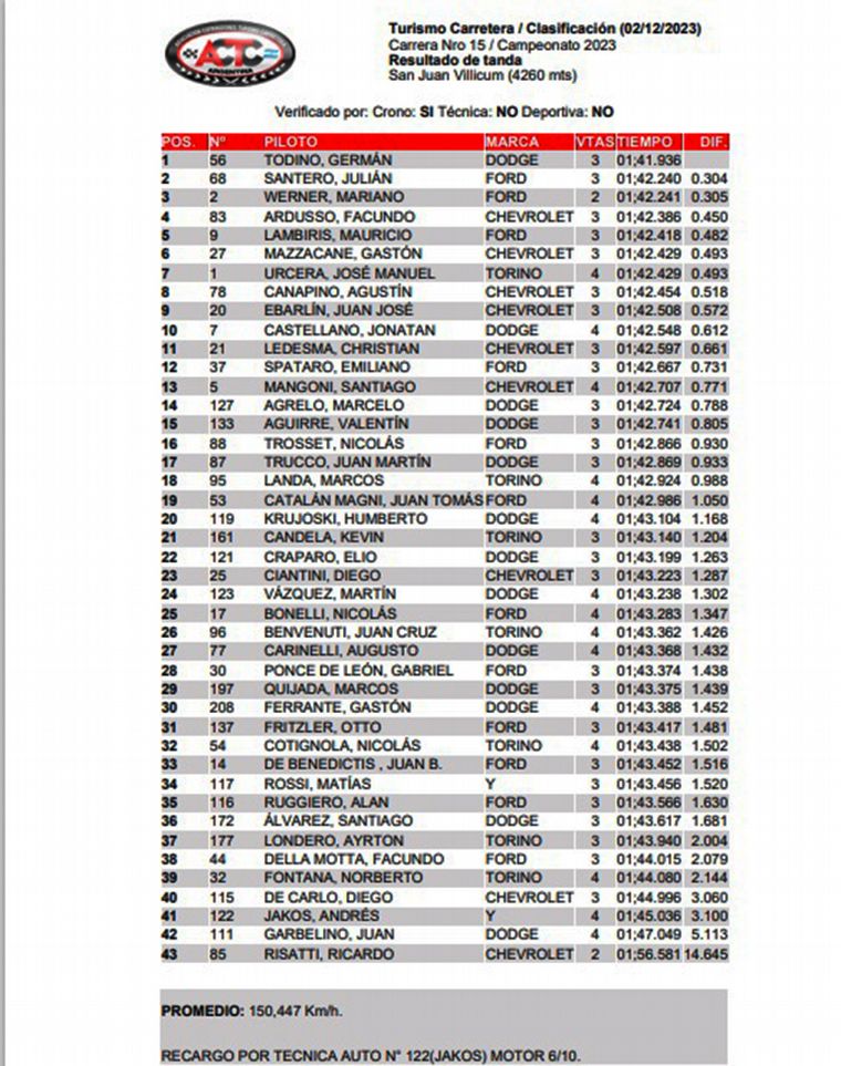Germán Todino de 23 años y oriundo de Rivera en la provincia de Buenos Aires, se quedó con lo mejor a la hora de clasificar en el Autódromo Internacional “El Villicum” de San Juan. Marcó con su Dodge 1’41”936/1000 para hacerse de la pole. Este domingo largará desde el mejor lugar en la primera serie a las 9:30.