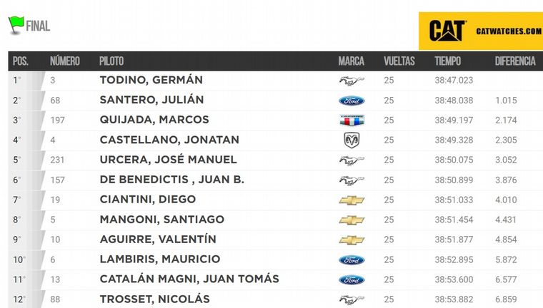 Lo hecho por Todino en la final de 25 vueltas fue superlativo, al largar con firmeza y soportar el asedio de Julián Santero urante toda la carrera, aún con el relanzamiento luego de la aparición del auto de seguridad en el giro 21 cuando volvieron a estar a la par.