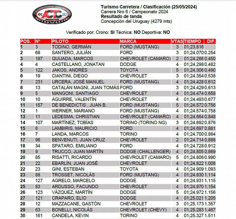El líder del campeonato con cinco fechas, José Manuel Urcera, también estrenó un Ford Mustang consiguiendo el séptimo lugar en la clasificación. Los cordobeses Ricardo Risatti (Camaro) y Facundo Chapur (Dodge) ocuparon el 20° y 35° lugar.