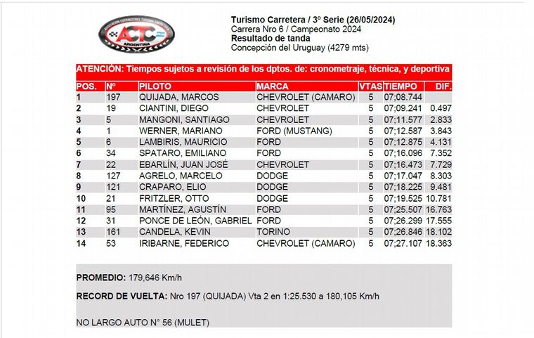 A las 13:00 se larga la final a 25 vuentas en la provincia de Entre Ríos, con Todino y su Mustang partiendo desde el mejor lugar de la primera fila, con Santero y su Ford al lado.