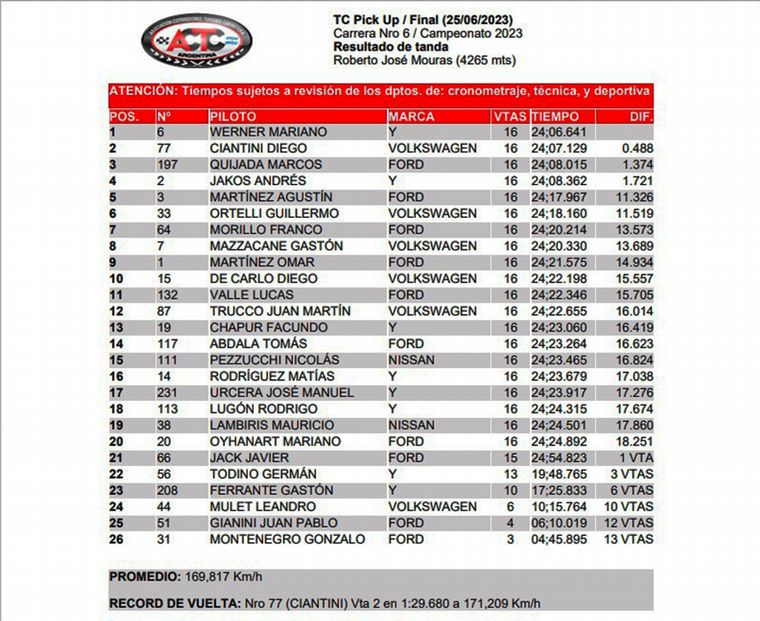 La conquista de Werner se hace importante, porque el joven Diego Ciantini con la Amarok #77 del “JP Carrera” lo intentó todo durante las 16 vueltas y no lo pudo lograr, aun cuando el joven de Balcarce que ya es un referente en la categoría lidera en el campeonato al cerrarse la mitad de la temporada 2023. Marcos Quijada con la mejor de las Ranger de Ford, completó el podio final.