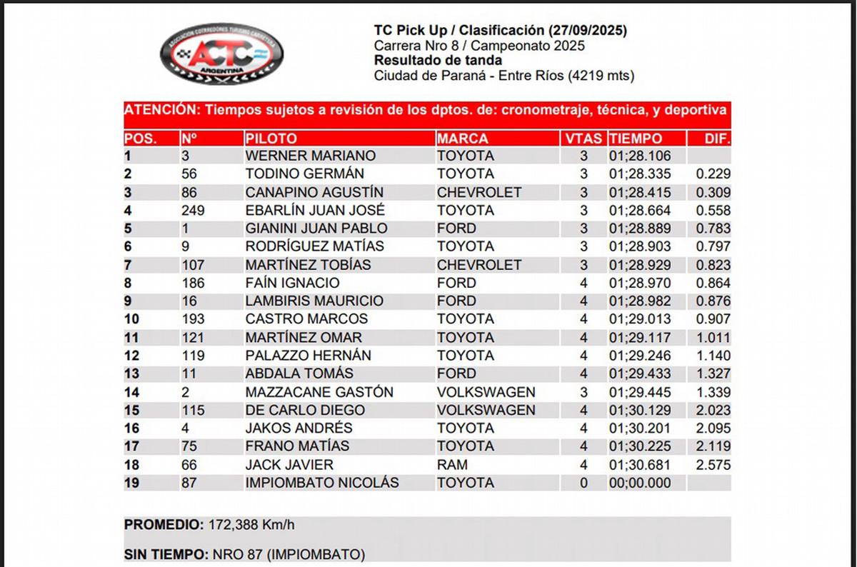 Pero Rodríguez se desdibujó muy pronto -lo habían beneficiado un buen juego de gomas, en los ensayos- y el 'Zorro de Paraná' saltó inmediatamente al tope de la lista, cuando finalizó su primera vuelta rápida. La expectativa quedaba abierta, porque Todino y Canapino estaban cerca. Pero nadie consiguió mejorar con su segunda vuelta y las cosas quedaron como estaban en el cierre de los 8' minutos de tanda. Tampoco, de los dos tercios siguientes -7 máquinas- salió ningún tiempo demasiado destacable y todo se confirmó con este orden: